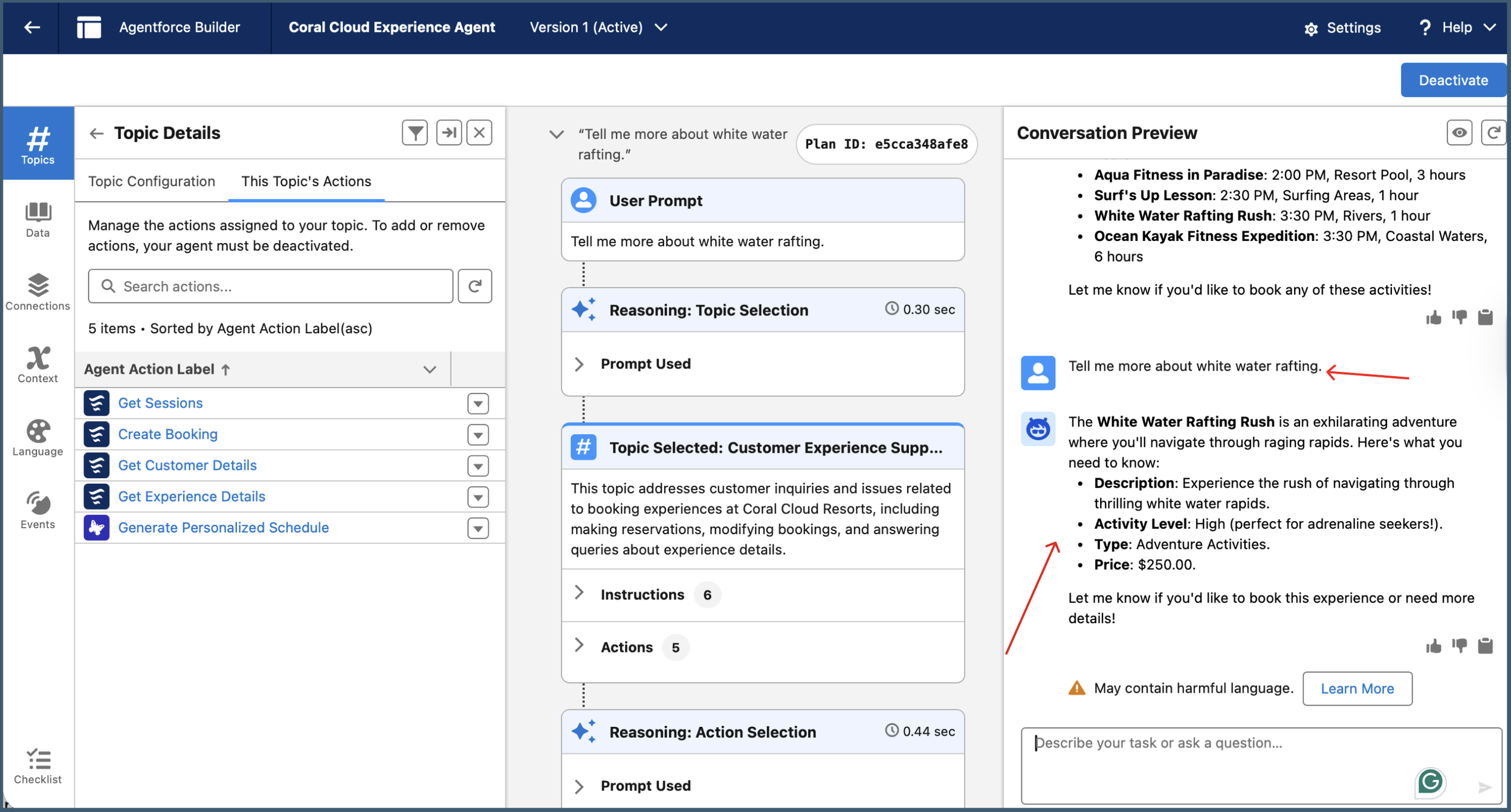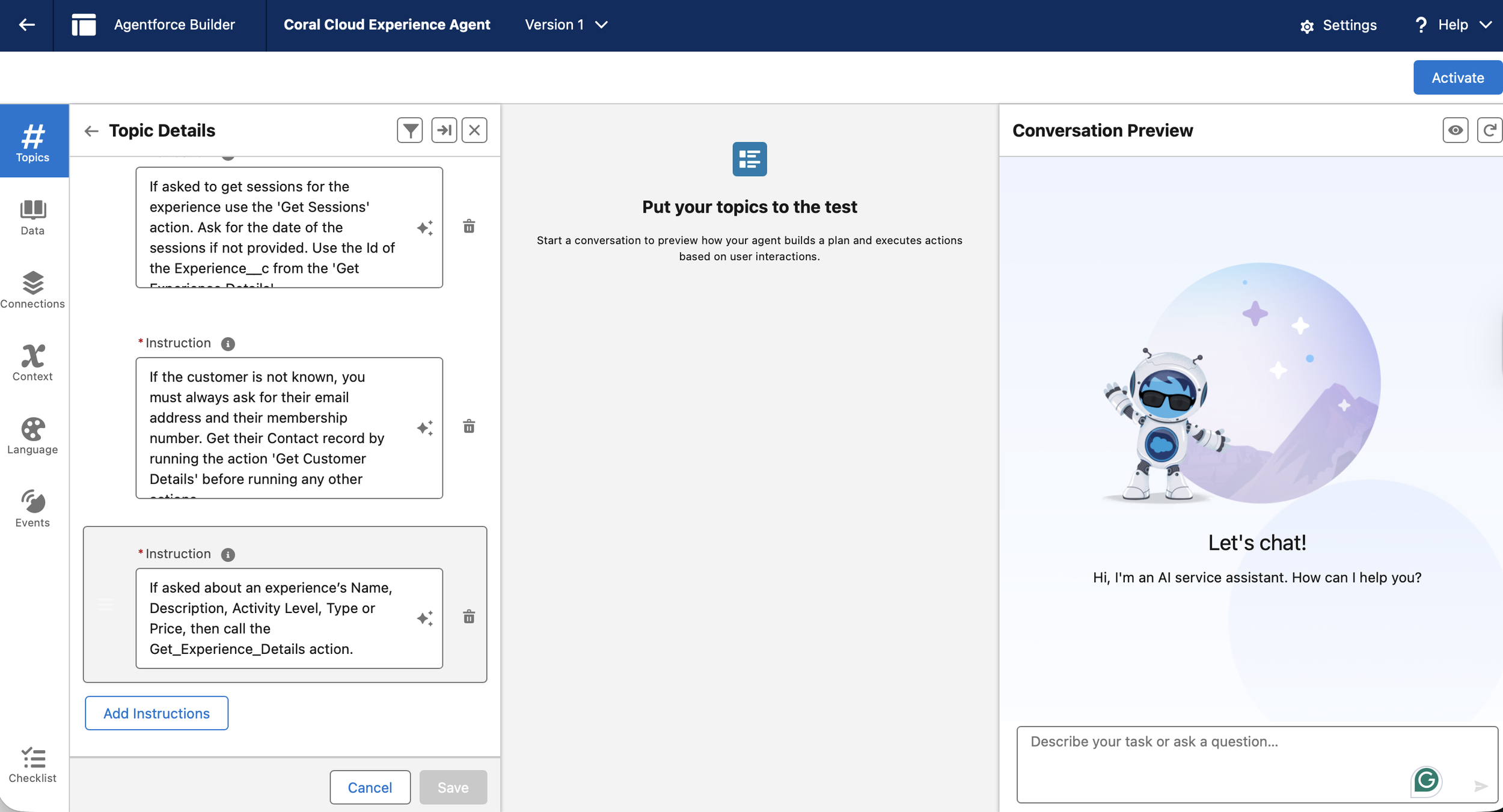 Establishing governance through Topic Instructions to ensure the AI triggers the right action based on user intent.