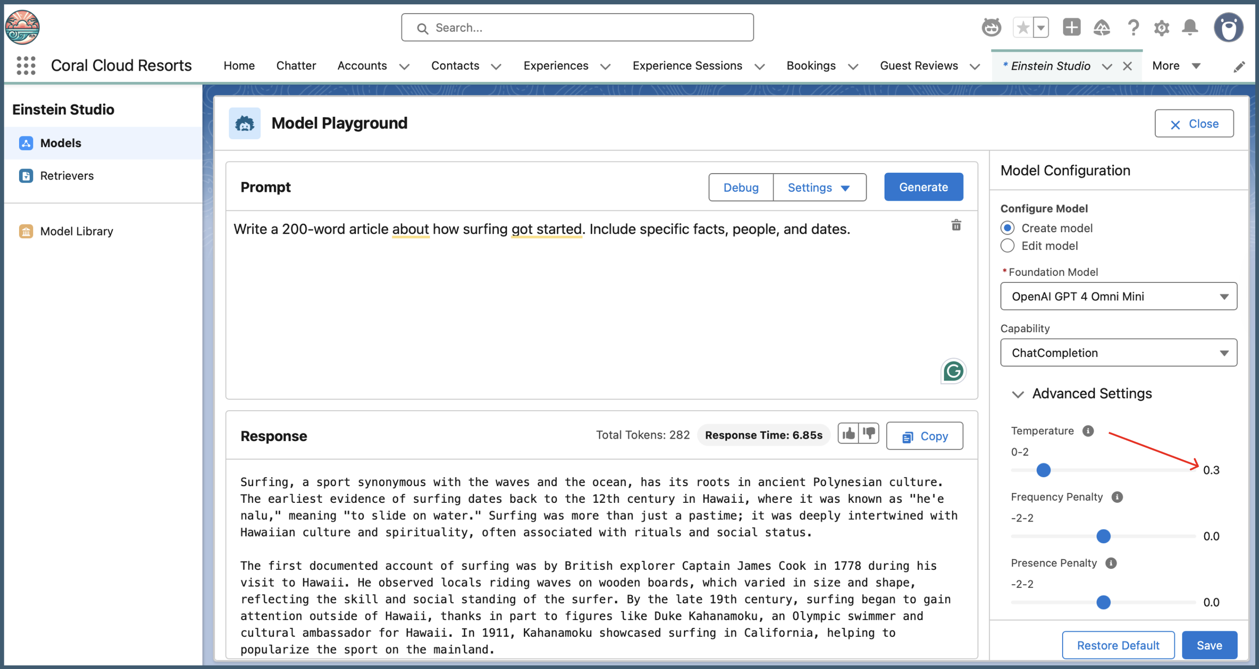 To "raise the bar" on reliability, I configured a Custom Model in Einstein Studio. I specifically adjusted the Temperature to 0.3.