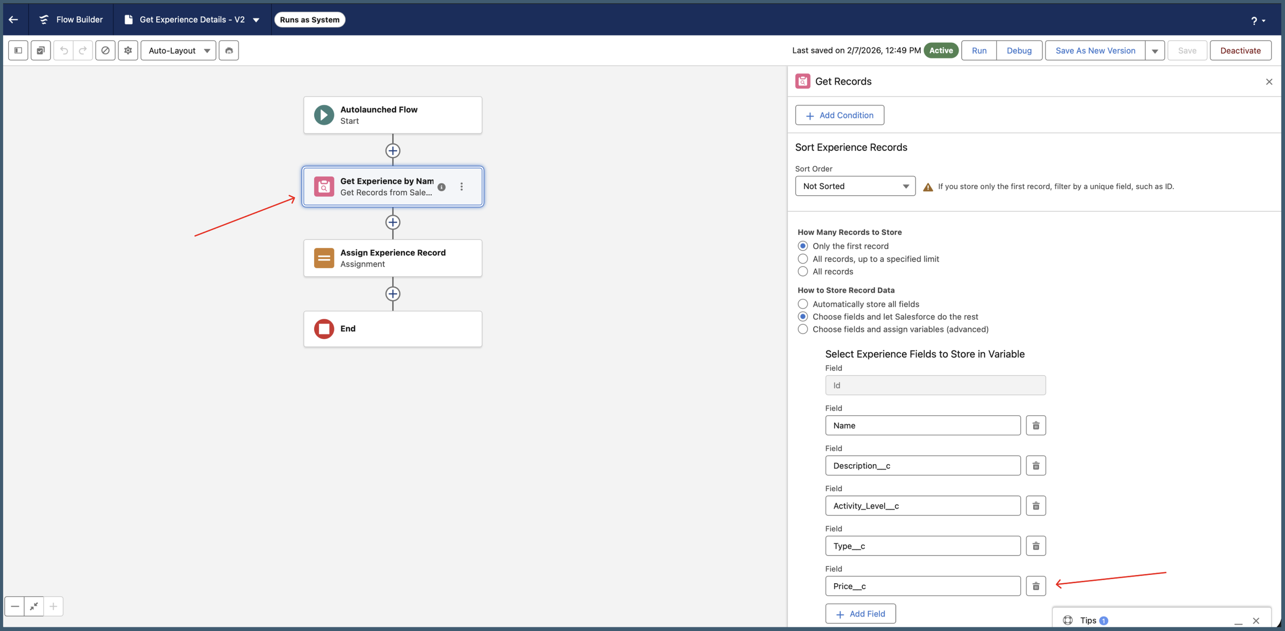 True systems thinking starts with the data architecture. I modified the back-end Get Experience Details flow to include the Price field. By updating this retrieval logic, I ensured the "plumbing" of the system could support the user's primary need: understanding value and cost.