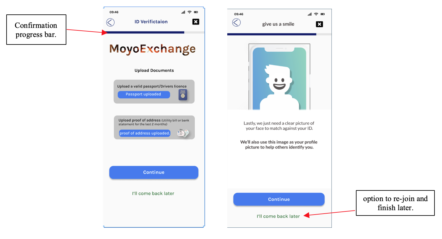 At this stage, users would have completed approximately 80% of the application process but still needs to submit a photo of their government issued ID document and face. Users felt the sign-up process would be completed at this point, how do I address that? using a confirmation of their progress bar with an option to rejoin and finish later would empower the user at this stage.