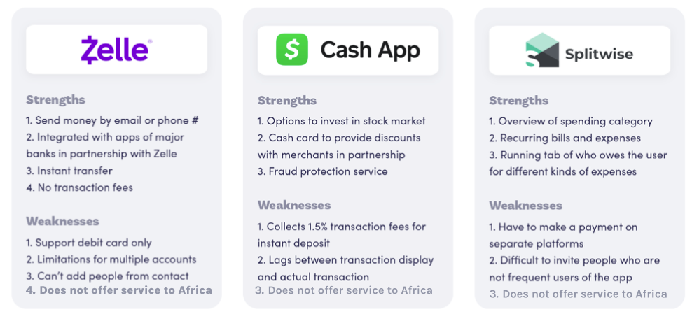 It is equally important to research other remittance payment apps, as their strengths and weaknesses will not only shed light on the key areas we should strive to maintain high quality but also help identify any opportunities for Moyo Exchange to emphasize. Based on the knowledge I gathered from market research, I analyzed three direct competitors, major remittance payment service providers and two indirect competitors who integrate P2P payment features into their service. A complete competitive analysis can be viewed Here.